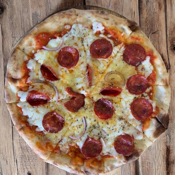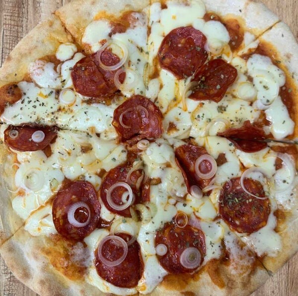 HOMEMADE TOTATO SAUCE, MOZZARELLA, CHILLI SAUSAGE, ONIONS,